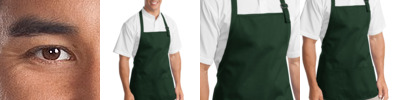100% cotton twill with Teflon; finish for added stain protection. 3 pouch pockets with a pen pocket. 1' wide neck and waist ties, adjustable neck strap. Measures 22'w x 24'l. No teflon on denim