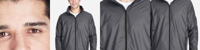 2.8 oz./yd² (US), 4.7 oz./L yd (CA), abrasion-resistant 100% nylon taslan shell with polyurethane coating for enhanced wind- and water-resistance 3 oz./yd² (US), 5 oz./L yd (CA), 100% polyester dyed-to-match tricot big hole mesh lining in body 1.7 oz./yd² (US), 2.8 oz./L yd (CA), 100% polyester taffeta lining in sleeves Roll-away three-piece hood with rain bill Black taping adds contrast to back and sleeves EZEM zipper in back lining for easy decoration access Center front/lower pockets with molded plastic zipper with garage